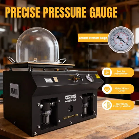 Compatible with epoxy resin, polyurethane, silicone, and more, this 6L vacuum caster is ideal for jewelry making, model casting, prototyping, and creative or industrial applications.